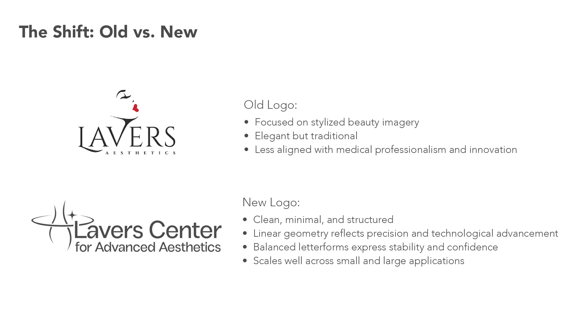 The client sought a logo and visual system with greater depth and modernization—one that aligns with nationally recognized aesthetic brands while remaining grounded in the local community. As Lavers’ services became more advanced, the branding needed to evolve alongside them, communicating credibility, innovation, and confidence without losing familiarity.