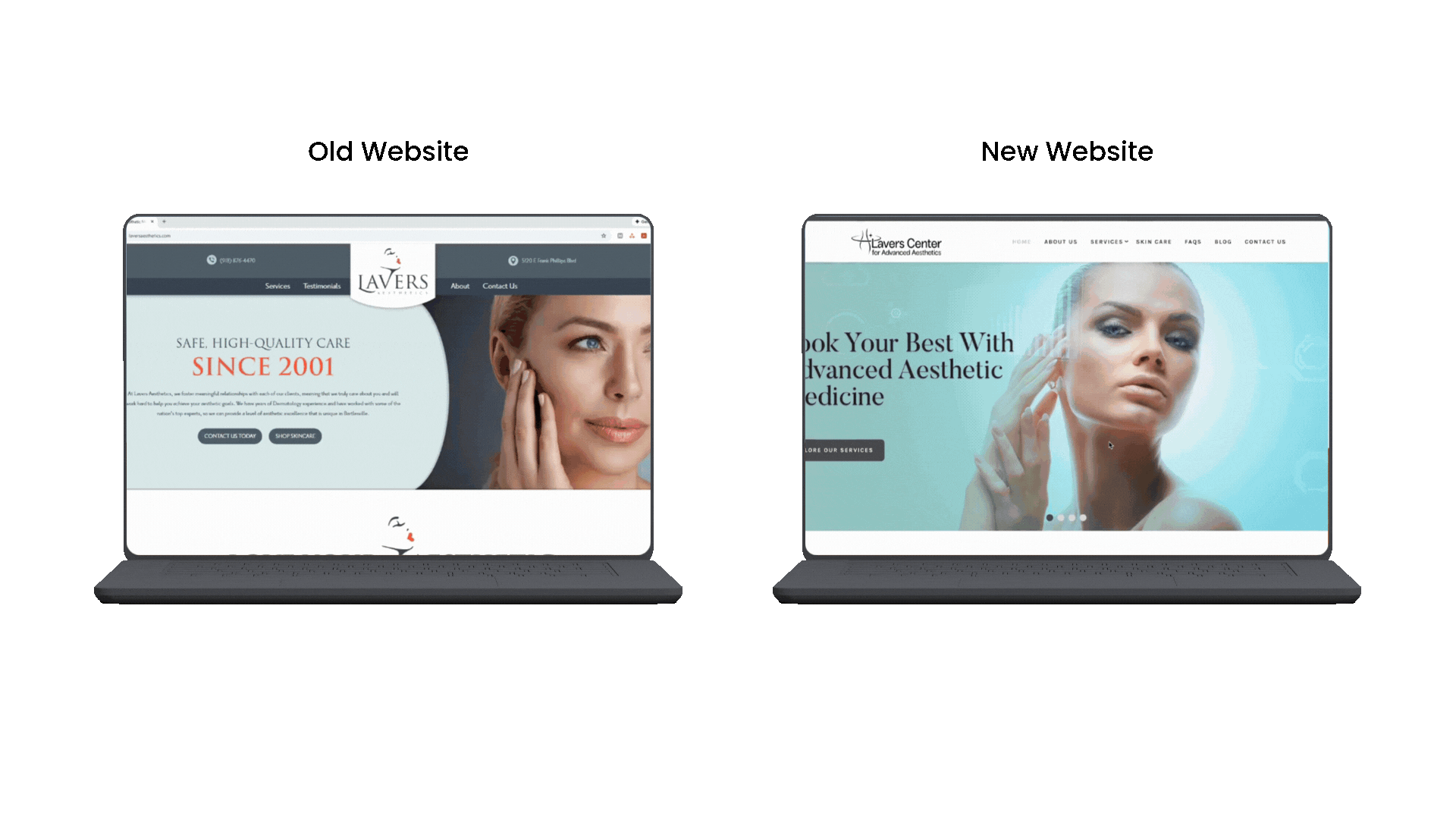 Side-by-side mockups of the old and new website clearly demonstrate the brand’s evolution from traditional aesthetics to a technology-forward medical experience.