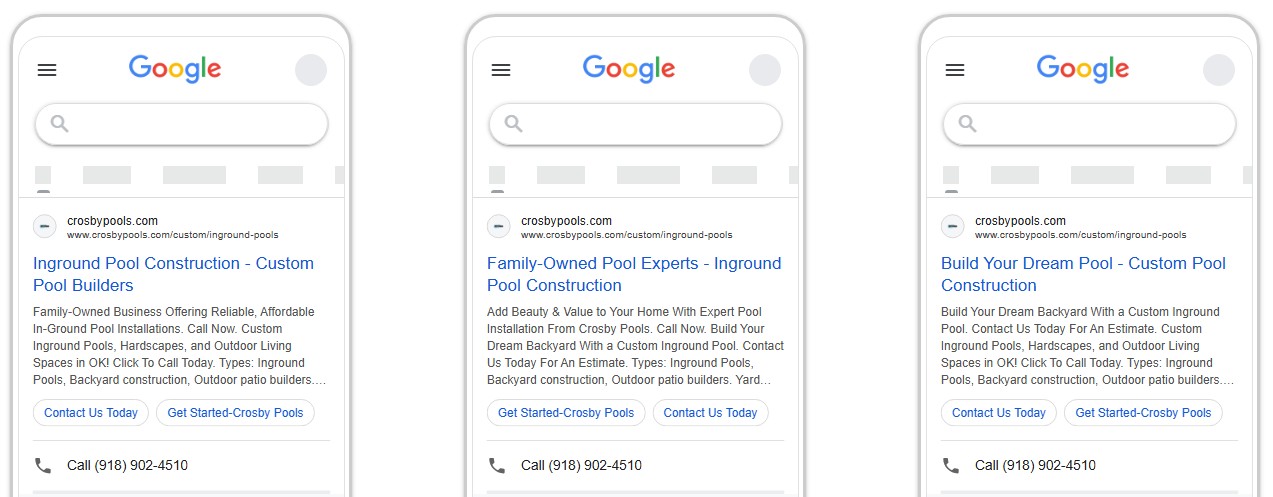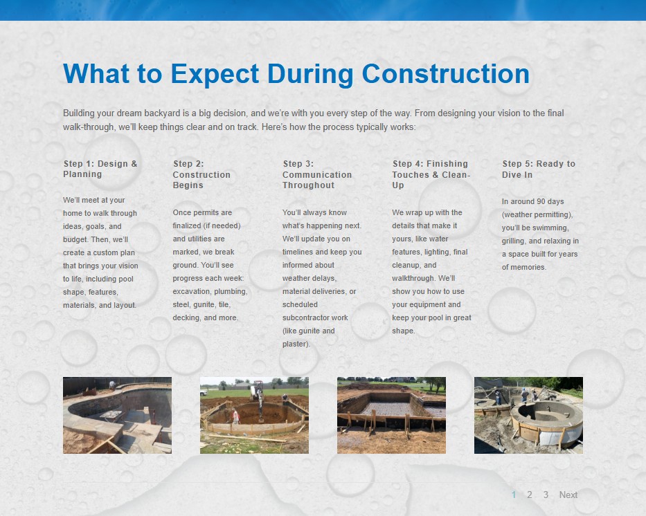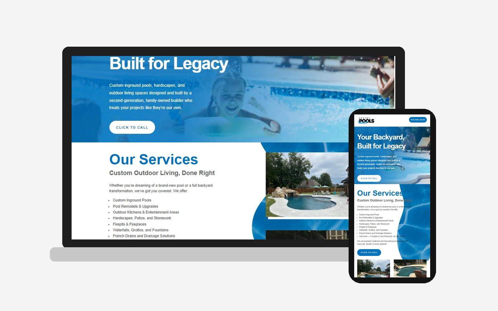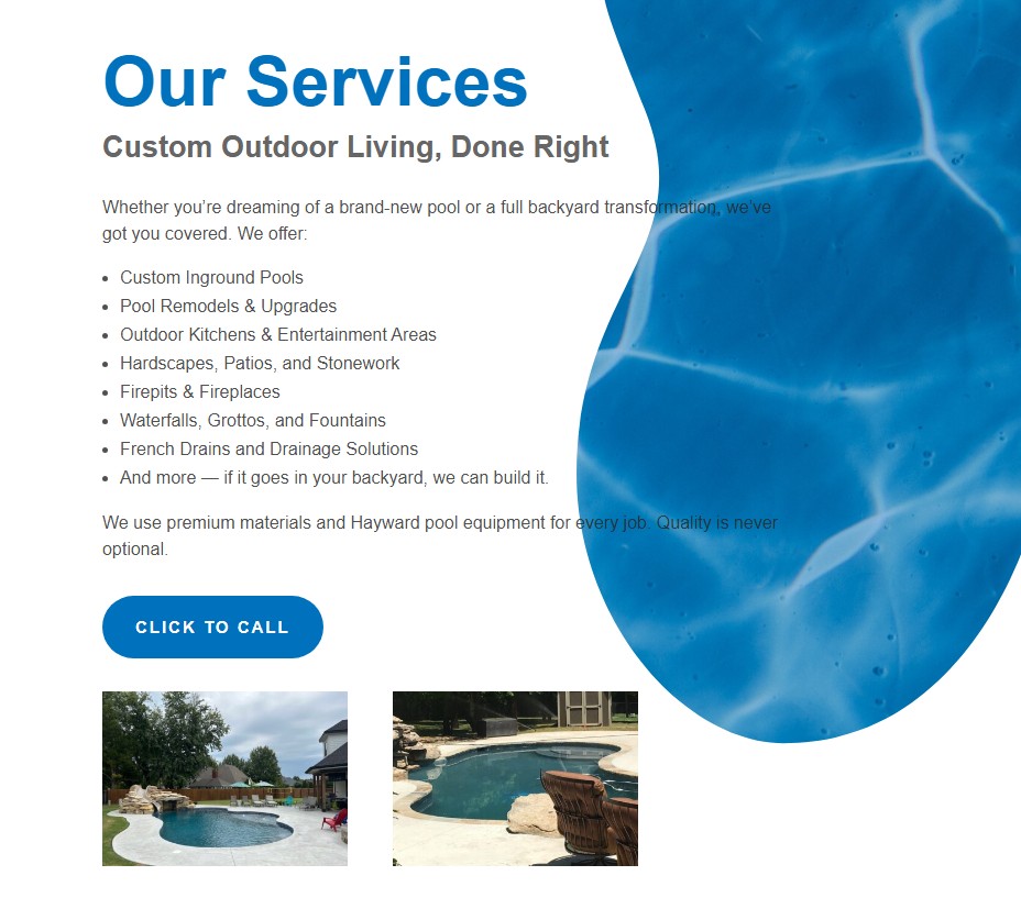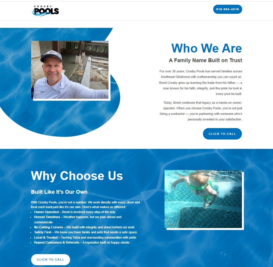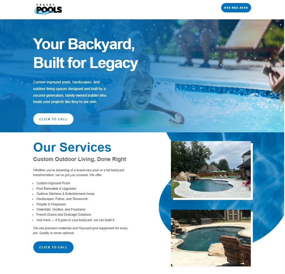 Crosby Pools was ready to refresh their online presence with a modern website that better reflected the quality of their work and the family legacy behind their business. Their goal was to showcase their custom pools and outdoor living projects while giving homeowners a clear, simple way to learn about services, view recent work, and quickly get in touch. It also needed to serve as the landing page for Google PPC Ads.