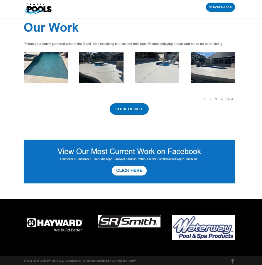 The Solution: Shield Bar Marketing designed and built a brand-new one-page website that highlights Crosby Pools’ services, portfolio, and company story in a clean, easy-to-navigate layout. The site was structured to guide visitors from learning about the company’s legacy to exploring services, viewing completed projects, and contacting the team. With a responsive design optimized for both desktop and mobile users, the new website presents Crosby Pools’ work professionally while making it simple for potential customers to connect and start planning their dream backyard.